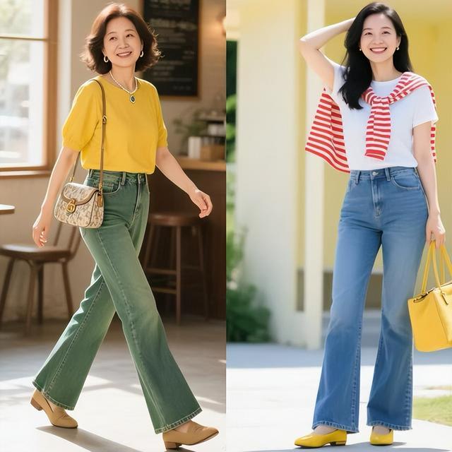 喇叭裤比阔腿裤更修身,裤脚微微外扩,能让腿部线条看起来更笔直。它对胯宽、大腿粗的人很友好,宽松的胯部设计能遮住赘肉,外扩的喇叭裤脚又能平衡比例。颜色选浅蓝色,比黑色更有减龄感,搭配短款上衣,轻轻松松打造出“上短下长”的黄金比例,显高又时尚。