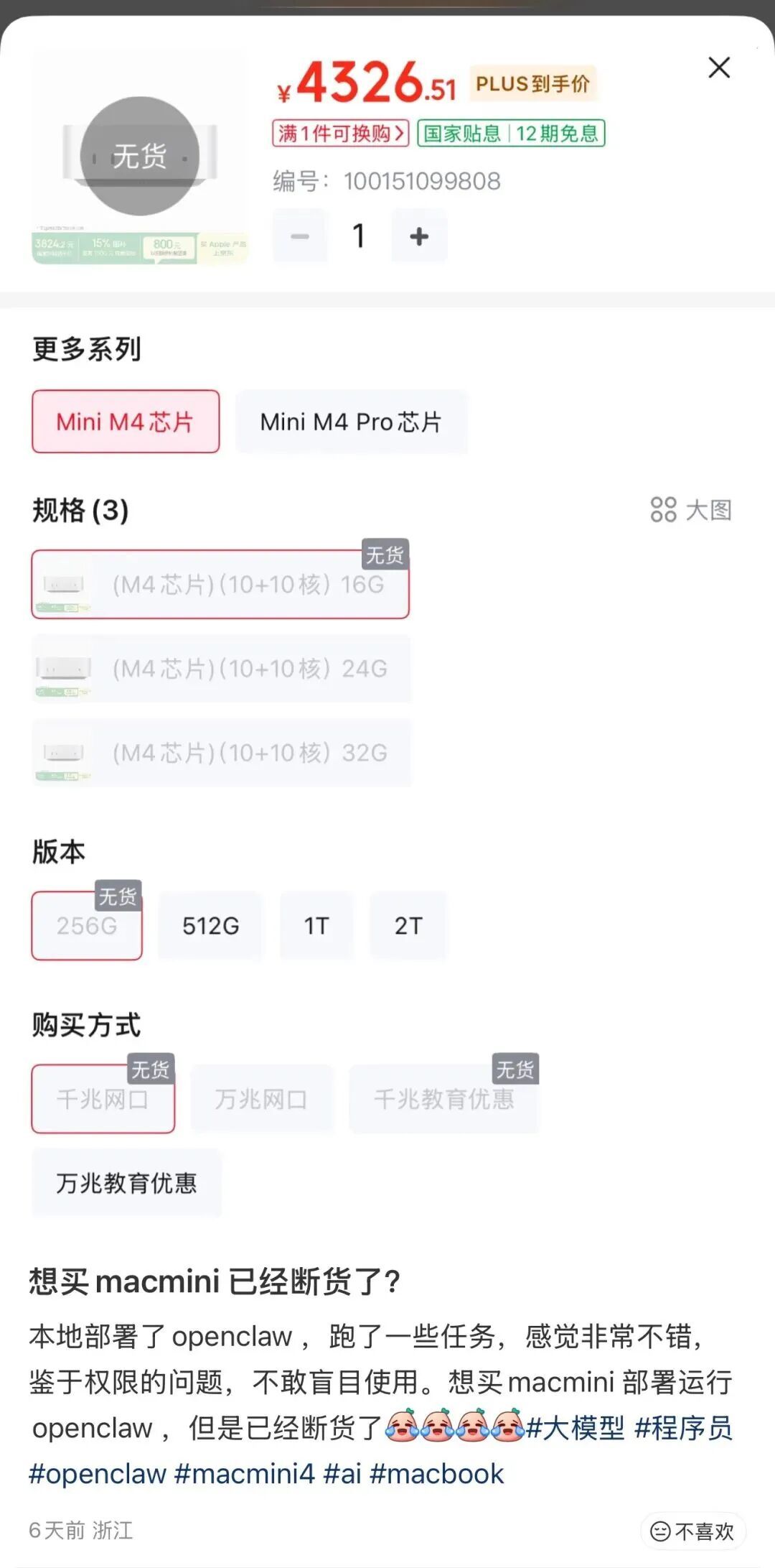 做OpenClaw的第一笔“标配”支出就是苹果的Mac mini。
