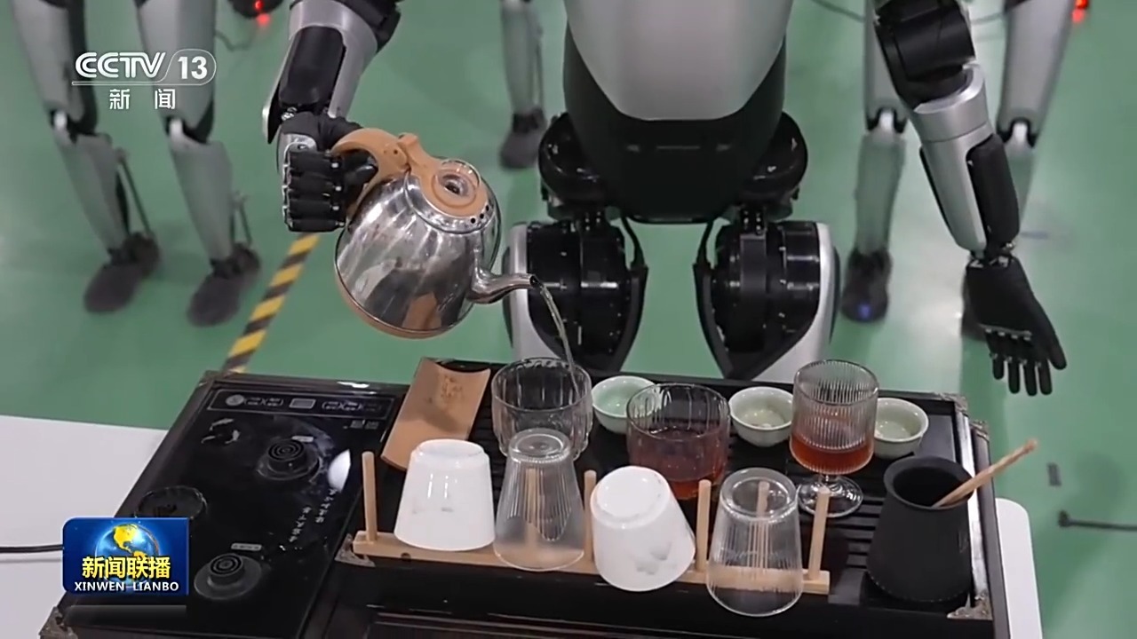 总台央视记者 王世玉:现在这些机器人正在进行出厂前的最后测试,那这台机器人正在练习泡茶,我们来体验一下。请给我倒一杯茶。我们看到机器人能精准地找到茶杯的位置,茶水量也是不多不少刚刚好。