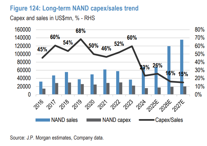 因此,现在的NAND扩产不再是简单的“买设备”,而是艰难的“技术迁移”。摩根大通预测,2026年全球NAND晶圆产出(Wafer Output)的同比增速仅为3%,这意味着供应增长几乎完全依赖技术升级(层数堆叠),而非新厂扩能。而在比特需求高达21%的增速下,这种供给侧的结构性限制将导致全年处于供不应求状态,支撑ASP暴涨40%。