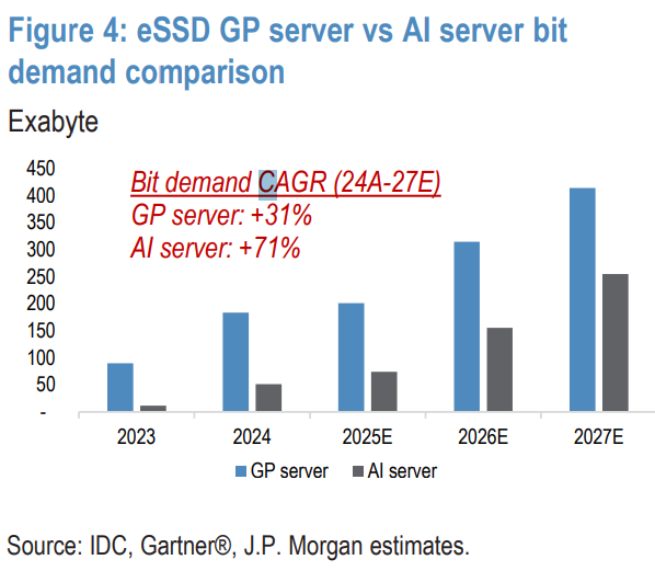 展望未来,摩根大通预测,AI服务器单机对存储容量的需求将达到70TB以上,是通用服务器(约20TB)的3倍以上。到2027年,eSSD将占据全球NAND比特需求的48%,彻底超越智能手机(30%)和PC(22%),成为NAND行业的第一大需求支柱。