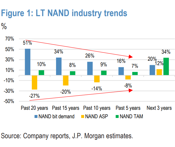 摩根大通复盘了过去25年的数据发现,无论是过去20年、15年还是5年,NAND行业的TAM(潜在市场规模)年均复合增长率(CAGR)始终徘徊在7%-12%的区间内。