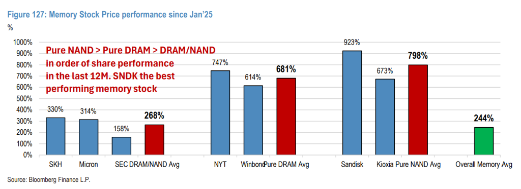 图注:自2025年1月以来,存储股虽然普涨,但纯DRAM和纯NAND标的的表现开始分化。摩根大通认为纯NAND标的(如铠侠)将在接下来的周期中展现更强弹性。