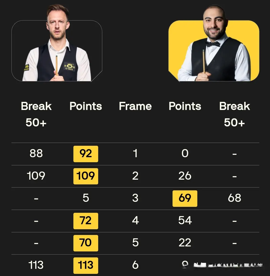 第二局,瓦菲率先拿到26分后失误,随后特鲁姆普单杆打出109分以109:26再胜一局2-0领先瓦菲。第三局,瓦菲凭借单杆打出68分的表现以69:5扳回一局1-2落后特鲁姆普。
